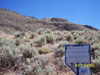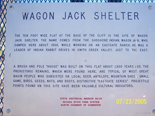 The ten-foot wide flat at the base of the cliff is the site of Wagon Jack Shelter. The name comes from the Shoshone Indian, Wagon Jack, who camped here about 1900 while working on an Eastgate ranch. He was a leader of Indian rabbit drives in Smith Creek Valley, just to the east. A brush and pole "house" was built on this flat about 1,500 years ago. The prehistoric remains, which were found here, are typical of most Great Basin people who subsisted on local deer, antelope, mountain sheep, small game, birds, seeds, nuts and roots. Distinctive "Eastgate Series" projectile points found on this site have been valuable cultural indicators. |