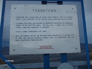 Franktown was established by Orson Hyde, probate judge of Carson County, Utah Territory, in the Wassau Valley (Washoe Valley) in 1855. A sawmill was built and became an important enterprise in furnishing timber to the Comstock mines. The Dall Mill, a quartz mill of 60 stamps, employed hundreds of workmen. Fertile farms surrounded the town. With the completion of the railroad from Carson City to Virginia City in 1869, the milling business rapidly lost its importance and the once prosperous town declined. |