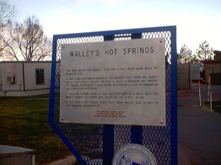 Like many Nevada hot springs, these dot a fault break along which the mountains rise. In 1862, along this Carson branch of the Emigrant Trail, David and Harriet Walley developed a $100,000 spa with 11 baths, a ballroom and gardens. The thermal waters (136 to 160 degrees Fahrenheit) became well known as a cure of "rheumatism and scrofulous affections." (sic) It sold for a mere $5000 in 1896 but functioned as hotel until 1935 when it burned. Its former cool cellar you see is still in use. In 1962, trial hydro-thermal power holes were drilled here as deep as 1,250 feet; maximum temperature is 181 degrees |