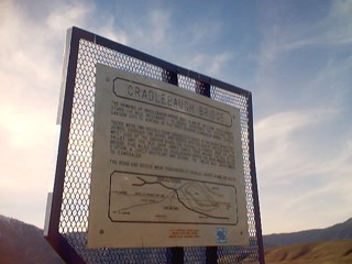 The remains of Cradlebaugh Bridge, built in 1861 by William Cradlebaugh, stand .25 mile westward. That bridge shortened the distance from Carson City to Aurora in the then booming Esmeralda Mining District. There were two routes from Carson City south to the bridge where they joined, crossed the river and headed into the desert. One followed the west side of the Carson River; the foothill alternate went via Jacks Valley and the old John James Ranch, then around the hill to the bridge. Five miles south of Cradlebaugh Bridge the road passed Desert Station, a lively hostelry, and beyond, the Twelve Mile House en route to Esmeralda. The road and bridge were purchased by Douglas County in 1895 for $4,000. |