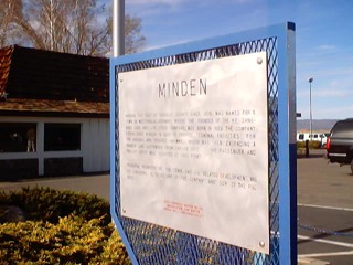 Minden, the seat of Douglas County since 1916, was named for a town in Westphalia, Germany, where the founder of the H.F. Dangberg Land and Live Stock Company was born in 1829. The company established Minden in 1905 to provide terminal facilities for the Virginia and Truckee Railroad, which was then extending a branch line southward from Carson City. The passenger and freight depot was situated at this point. Principal promoter of the town and its related development was H.F. Dangberg, Jr., secretary of the company and son of the founder. |