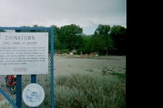 The first Chinese were brought to this site in 1856 to build the "Reese" ditch from the Carson River to the entrance of Gold Canyon. The ditch was used for placer mining. The Chinese soon began reworking the placers, earning a living from those abandoned by the miners. So many Chinese followed (200, plus or minus) that the settlement was called Chinatown. The name was changed to Dayton in 1861 in honor of john Day, who laid out the town and later became Surveyor General of Nevada. |