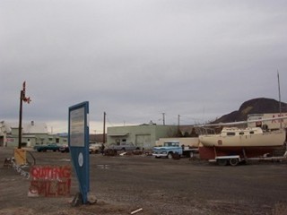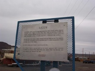 Hazen was named for William Babcock Hazen, who served under General Sherman in his "march to the sea." The town, established in 1903 to house laborers working on the Newlands Irrigation Project south of here, included hotels, saloons, brothels, churches and schools. In 1905 the first train came through on the new routing to Tonopah. In 1906 the Southern Pacific Railroad built a large roundhouse here as well as a fine depot. In 1908 Hazen was nearly destroyed by fire. As a tough town, it had no peer in the state. Nevada's last lynching occurred in Hazen when "Red" Wood was taken from the wooden jail and hanged on February 28, 1905. |