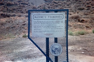 Messers. Mead, McCone and Tascar first established a foundry in this area in 1862 at Johntown two miles southeast of here in Gold Canyon. After two years they moved their operation to this point and erected a large granite building. John McCone became the sole proprietor in 1866. A fire on May 15, 1872, left nothing standing but the walls. McCone then bought the Fulton Foundry in Virginia City and made it the largest in the state; 110 men were employed at its peak. All the early castings of the Virginia and Truckee Railway were manufactured at Fulton's. The largest casting (in its time) poured on the Pacific Coast was made at Fulton's on December 11, 1880. |
