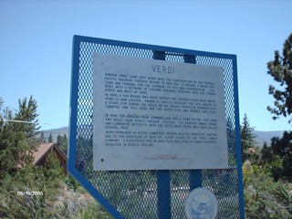 Modern Verdi came into being with the construction of the Central Pacific Railroad through Nevada in 1867-69. It became a major mill town and terminal for the shipment of ties and construction timbers, with a network of logging railways reaching into the timber north and west of here. In 1860, a log bridge was built across the Truckee River near where Verdi is now located. Known as O'Neil's Crossing, the site served as a stage stop during the 1860's on the heavily traveled Henness Pass turnpike and Toll Road and the Dutch flat and Donner Lake Road. In 1864, the Crystal Peak Company laid out a town on the site some two milesfrom Verdi's present location. The company owned mining and lumbering interests near the settlement which was then called Crystal Peak. Verdi remained an active lumbering center into the twentieth century due to the exertions of men like Oliver Lonkey of the Verdi Lumber Company. A disastrous fire in 1926, plus depletion of timber reserves, resulted in Verdi's decline. |