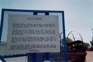 Ragtown was never a town, but the name of a most welcome oasis and hamlet. This mecca on the banks of nearby Carson River received its name from the appearance of pioneer laundry spread on every hand bush around. The Forty-Mile Desert, immediately to the north, was the most dreaded portion of the California Emigrant Trail. Ragtown was the first water stop after the desert. To the thirst-craved emigrants and their animals, no site was more welcome than the trees lining the Carson River. Imagine, if you will, the moment when the animals first picked up the scent of water--the lifted head, the quickened pace, and finally the mad, frenzied dash to the water's edge. Then, rest and repair for the arduous crossing of the Sierra Nevada that lay ahead. In 1854, Asa Kenyon located a trading