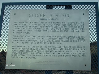Seven-tenths of a mile east of this marker was Geiger's Station, the largest station on the Geiger grade toll Road, the main thoroughfare between the Comstock Lode and the ranches of the Truckee Meadows. Located at the site were a toll house, three blacksmith shops, three barns, several corrals and an inn, Magnolia House. During the boom years of the Comstock Lode, the sixties and the seventies, the station was crowded with freight outfits, stagecoaches and weary teamsters. Passing travelers could stop off at the inn for a drink or a quick meal. Following the extension of the Virginia and Truckee Railroad to Reno in August , 1872, the toll road fell into disuse and a few years later became a public highway. Magnolia House continued operating until 1915. Social activity at the inn included dances which attracted residents from Virginia City, nearby valleys, and the Truckee Meadows. |
