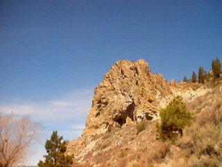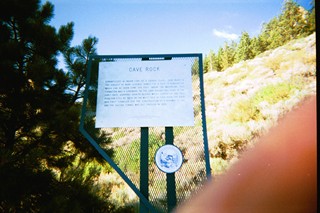 (Interpretive text is currently undergoing revisions) Romanticized in Indian lore as a sacred place, Cave Rock is the subject of many legends. Named for a cave, a remenant of which can be seen some 200 feet above the waterline, this formation was a landmark on the Lake Bigler Toll Road in the early days. Quarried granite blocks which supported the toll road can still be seen on the west face of Cave Rock, as can the remains of the old wooden trestle. The rock was first tunneled for the construction of a highway in 1931 and the second tunnel was put through in 1958. |