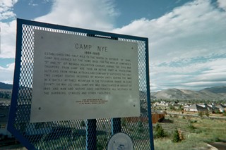 Established one-half mile to the north in October of 1864, Camp Nye served as the home base for the men of Companies D and E, 1st Nevada Volunteer Cavalry, during the Civil War. Troopers from Camp Nye took an active part in protecting settlers from Indian attacks and Company D suffered the only two combat deaths incurred by Nevada Units during the War in a battle at Table Mountain in the Tuscarora Range in Elko County on May 20, 1865. Camp Nye was deactivated in August of 1865 and man and nature have obliterated all vestiges of the barracks, stables and other facilities. |