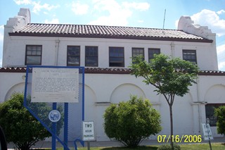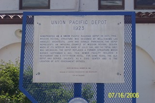 Constructed as a Union Pacific Railroad Depot in 1923, this Mission Revival structure was designed by well known Los Angeles architects John and Donald Parkinson. The depot represents an imposing example of Mission Revival design. Much of its interior was made of solid oak and the total cost was $83,600. The depot replaced a former structure which burned Sept. 9, 1921. This newer facility included a restaurant and a fifty-room hotel. For some years, the old depot has served Caliente as a civic center and is the location of city government offices. |