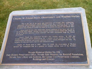 This is the site of the house and observatory of Nevada's first weatherman, astronomer, and seismologist, Charles William Friend. Born in Prussia in 1835, Friend immigrated by way of South America to California during the 1849 Gold Rush. In 1867, he moved from Folsom to Carson City where he sat up his own jewlery and optical store. Friend built Nevada's first observatory located southwest of his house and east of the Nevada State Capitol. Nevada's U.S. Senator William Stewart helped him obtain the use of a six-inch equitorial mount telescope and other instruments from the federal government. Charles Friend also established Nevada's first weather service. In 1887, the Nevada Legislature passed authorization for a weather service station in Carson City, Friend became its director and created volunteer weather stations throughout the state. He compiled the data into reports that are still referenced today. Charles W. Friend dies in 1907. Since his death, the Association of Weather Services has recognized him as a pioneer in weather service west of the Rockies. |