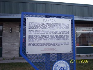 Southern Nevada's first permanent settlement and perhaps one of its most unique was settled as a Mormon colony by Francis C. Lee and others in 1864. Poor in resources, but rich in people, Panaca has changed but slowly down through the years. Although mining at nearby Bullionville and Pioche has had its effect, Panaca remains an agricultural community. The post office was established in 1867, moved to Bullionville in 1874, and returned to "Panaker" in 1879. During the 1870's, coke ovens produced charcoal here for the smelters at Bullionville. Originally located in Washington County, Utah, Panaca became a portion of Nevada by an act of Congress, dated May 5, 1866. As the boundary was not then surveyed, a dispute arose over taxes levied by Lincoln County, Nevada. Only after a long period of bitter litigation was the matter settled in favor of the Panaca citizenry on December 4, 1871. There are those who lived and died in this community where they were born; others became world travelers. In their unspectacular way, many helped created the great pioneer story. |