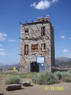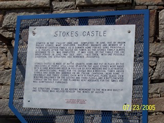 Started in the fall of 1896 and completed in June, 1897, by Anson Phelps Stokes, mine developer, railroad magnate and member of a prominent eastern family, as a summer home for his sons, principally J.G. Phelps. After the castle (or the tower, as the Stokes family always referred to it) was completed, it was used by the family for one brief period in June and July, 1897. Since then, with one possible exception, the structure has remained unoccupied. Stokes Castle is made of native granite, hewn and put in place by the ancestors of people still living in Austin. The huge stones were raised with a hand winch and held in position by rock wedging and clay mortar. The architectural model for the castle was a medieval tower Anson Stokes had seen and admired on an Italian campagna, near Rome. It originally had three floors, each with a fireplace, plate glass view windows, balconies on the second and third floors, and a battlemented terrace on the roof. It had plumbing very adequate for the times and was sumptuously furnished. The structure stands as an abiding monument to the local men who built it and to those who helped develop the mines of Austin. |
