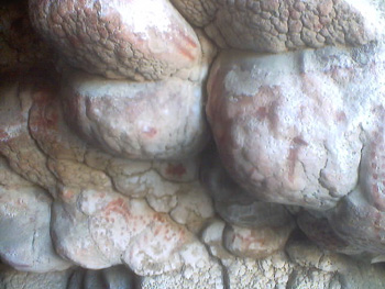 The wall is covered with faded paint designs.